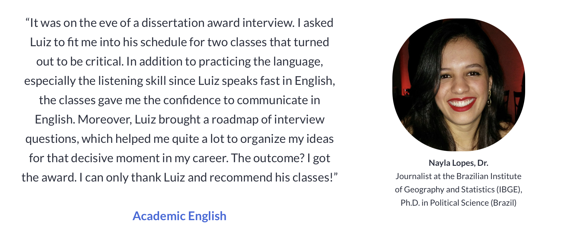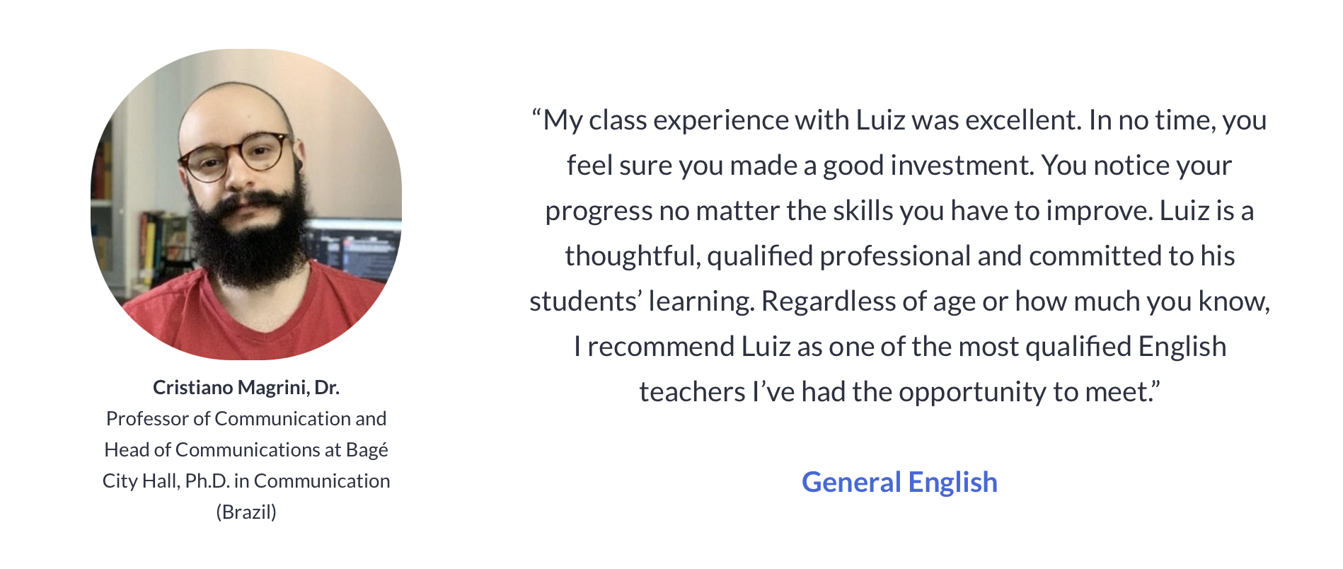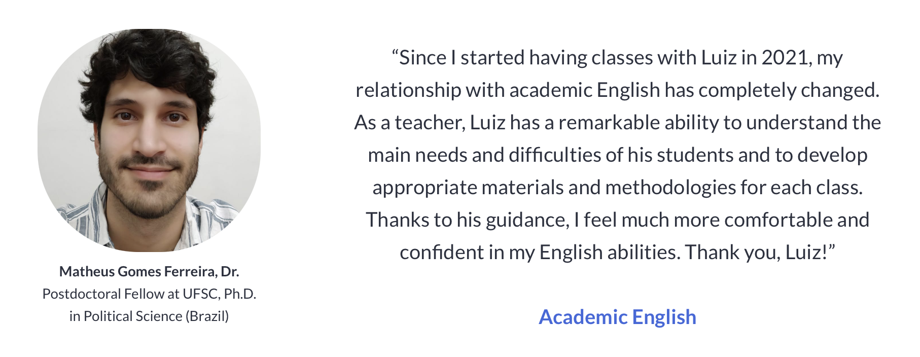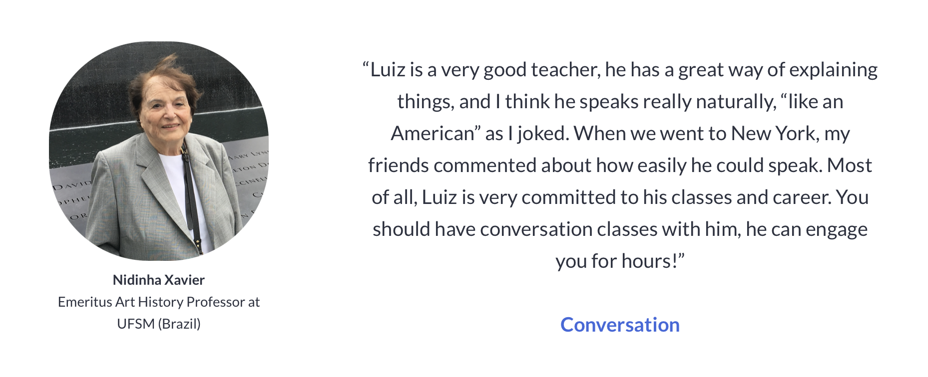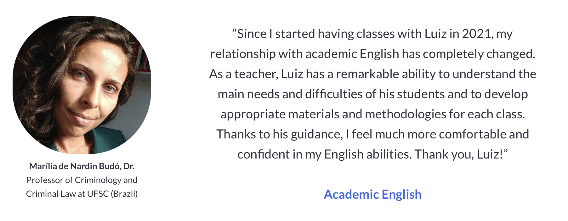 With over 10 years of English teaching experience, I hold an M.A. in Communication and Culture from UFRJ (Brazil, 2013) and am currently pursuing my Ph.D. at UFMG (Brazil). My teaching experience spans four years at a leading English school, where I worked with hundreds of students across all proficiency levels, followed by extensive private tutoring. I specialize in English for Academic Purposes (EAP), conversation skills, Business English, and test preparation for TOEFL (iBT and ITP) and other proficiency exams. I have successfully prepared professionals for job interviews at organizations including the UN and FIESP (São Paulo), journalists for international coverage assignments, and students for international scholarship and graduate program applications. My academic journey includes fieldwork at a nonprofit in the United States and research presentations at conferences across Australia, Ecuador, Germany, Greece, Portugal, and the United States. My youngest student was 4 years old, and my oldest was 83.
