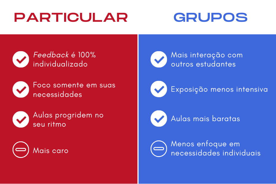 Como um professor dedicado às necessidades de meus e minhas estudantes, a maioria daqueles que trabalham comigo fazem aulas particulares individuais (conhecidas como 1:1). Duplas também são possíveis. Seja qual for o caso, você deve considerar os prós e contras de cada formato. A imagem a seguir compara as principais características das aulas particulares individuais, nas quais há apenas um ou uma estudante com o professor, com as de grupos formados por duas pessoas: