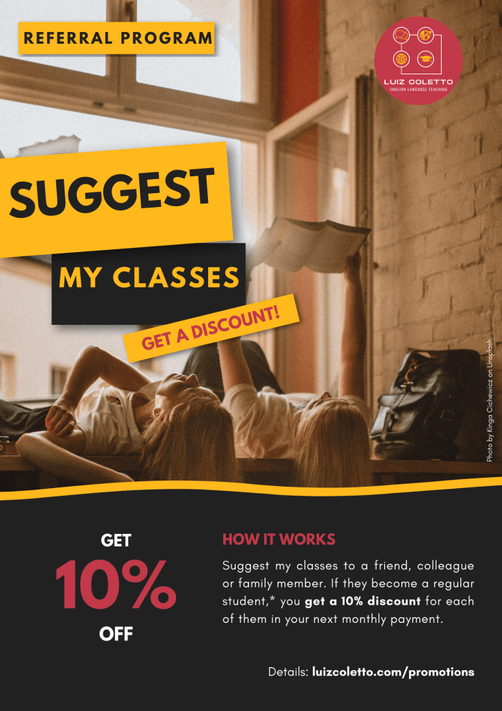 - This promotion is valid from September 1 to October 2, 2022. If someone you recommended my classes to becomes a regular student* by October 2, you will benefit from the discount starting in November 2022.