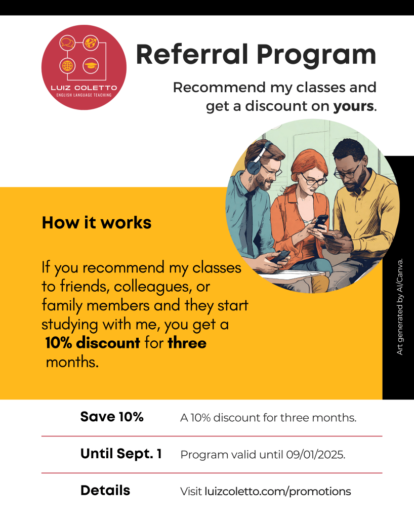 - This promotion is valid from July 15 to September 1, 2025. If someone you referred to my classes becomes a regular student* by September 1, you will benefit from the discount starting in September 2025.