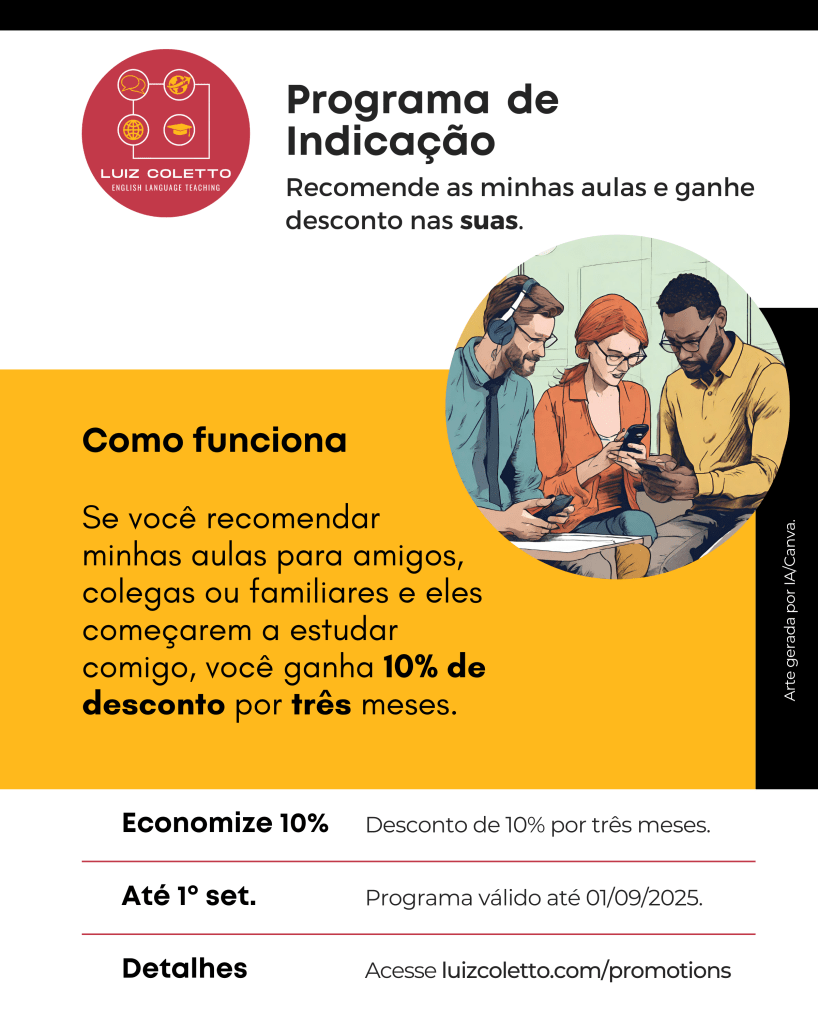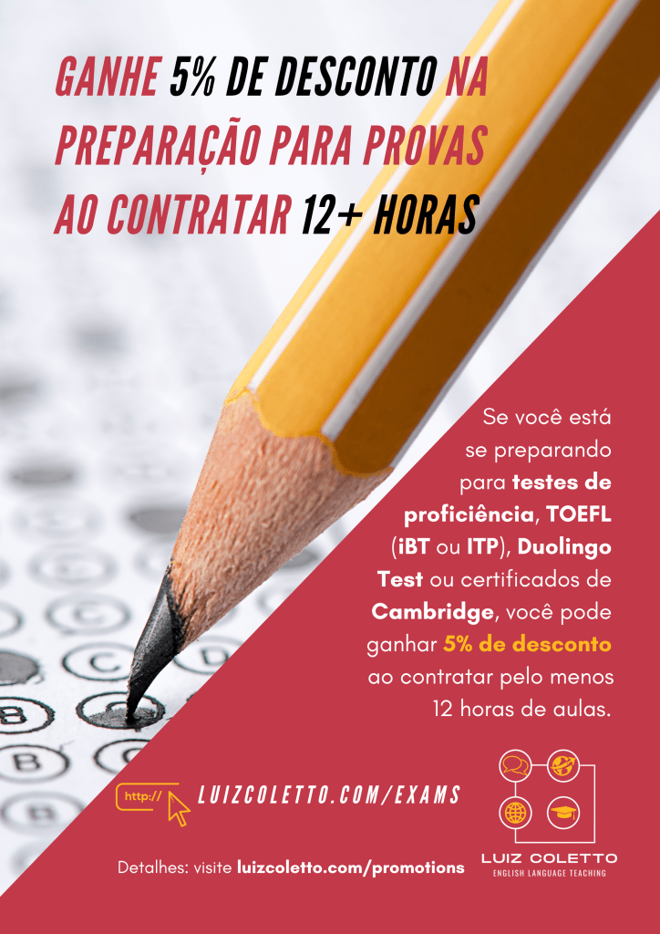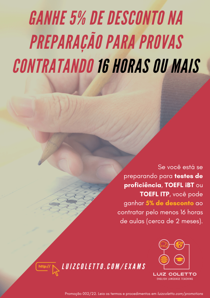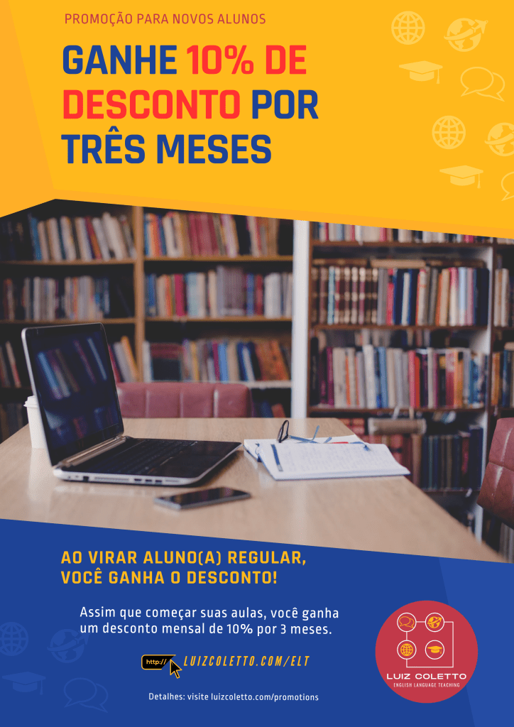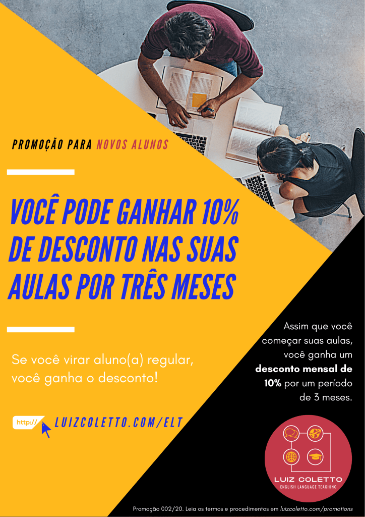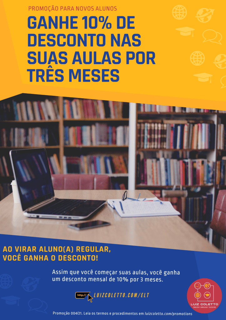 Esta promoção é válida de 20 de fevereiro a 30 de abril de 2022. Se você se tornar aluno(a) regular* até 30 de abril, poderá se beneficiar do desconto até o início de julho de 2022.O desconto se aplica a você assim que você se torna estudante regular.**Estudantes regulares são aqueles(as) que têm 2 aulas por semana (geralmente 8 horas por mês).A promoção se aplica a todos os cursos e aulas, exceto para as aulas de Preparação para provas.O desconto de 10% é concedido mensalmente, portanto você não poderá se beneficiar dele após duas ou três semanas de aula ou em combinação (por exemplo, um desconto de 20% para aulas extras em um determinado mês).Essa promoção não é cumulativa com nenhuma outra. Se você estiver se beneficiando de outras promoções, poderá aplicar esse desconto promocional depois de finalizar o uso da primeira promoção.Se, por qualquer motivo, você parar de ter aulas comigo enquanto se beneficia desta promoção, o desconto não será convertido em créditos ou compensações futuras por aulas restantes.O desconto de 10% aplica-se somente aos valores de aulas e cursos, mas não a livros ou outros materiais.Circunstâncias não previstas serão discutidas entre o professor e cada estudante.